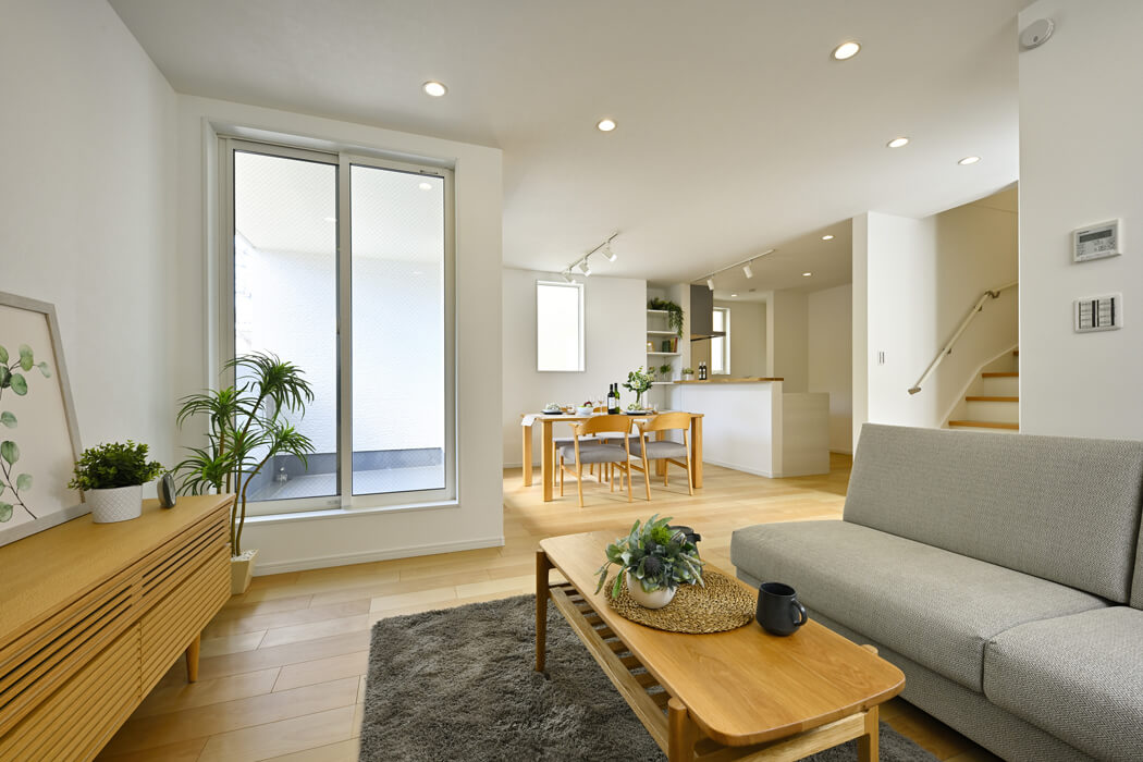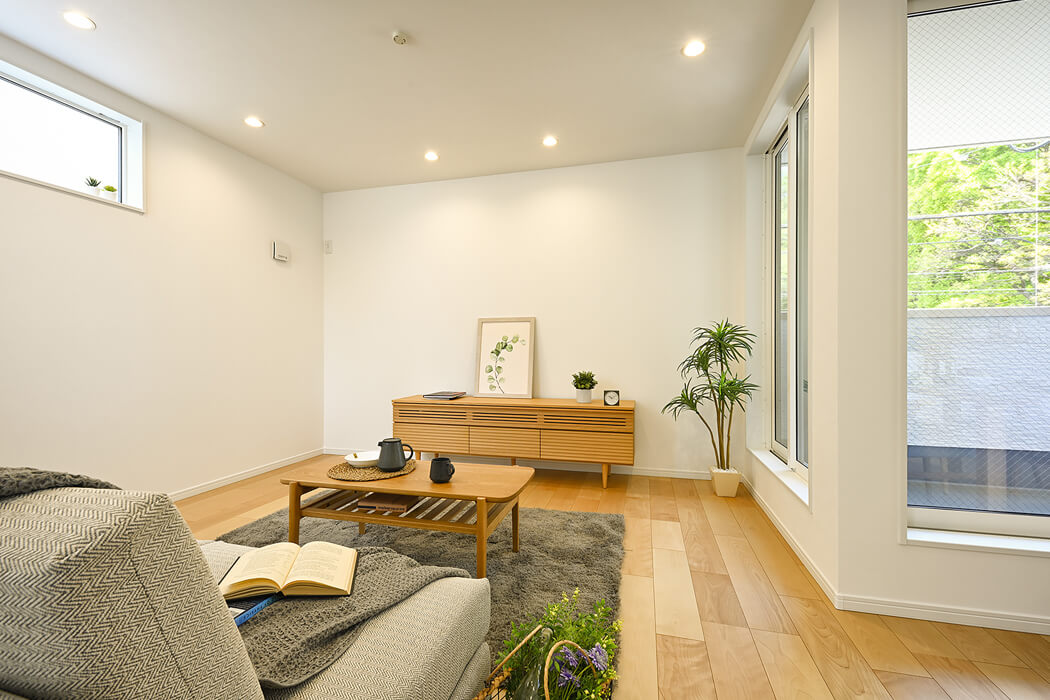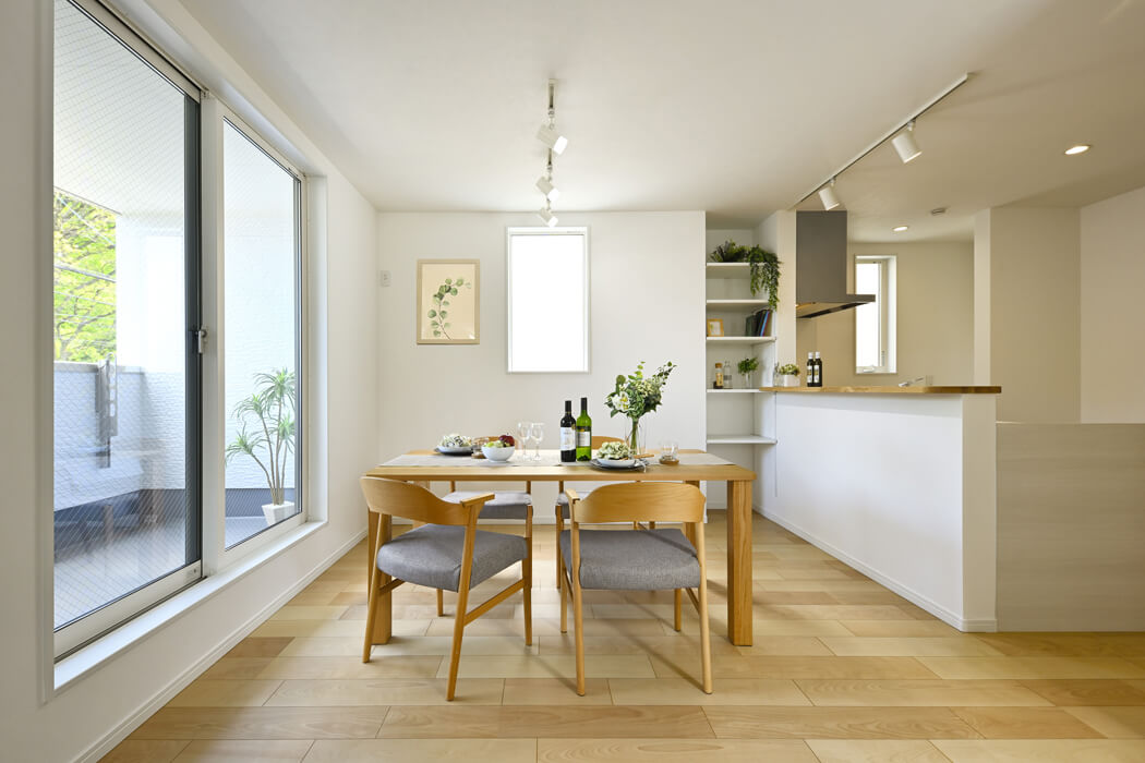 人通りの多い道路に面しているこちらのお宅は、外観から家の中が見えないように配慮しながらも、家の中は心地のよい光が感じられる空間が広がっています。特に2階のリビングダイニングには、奥行きのあるベランダを配置しており、リビング側とダイニング側の両面から採光を取り入れることで、部屋全体に自然光が行き渡ります。これにより、明るく開放的なリビングダイニングが実現しています。また、3階部分にはバルコニーの腰壁を高く設計し、プライバシーを確保しつつも開放感を感じられる工夫が施されています。