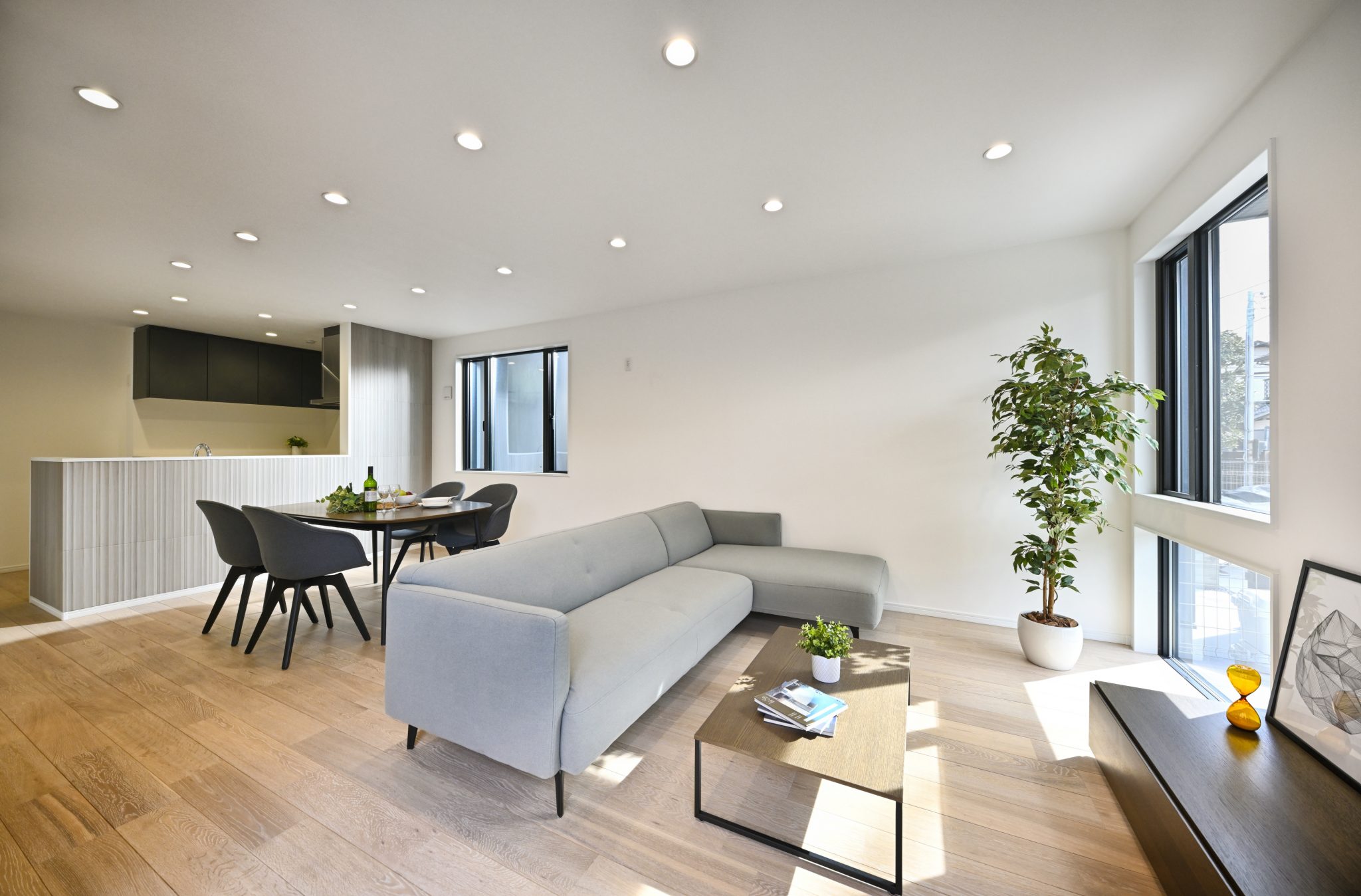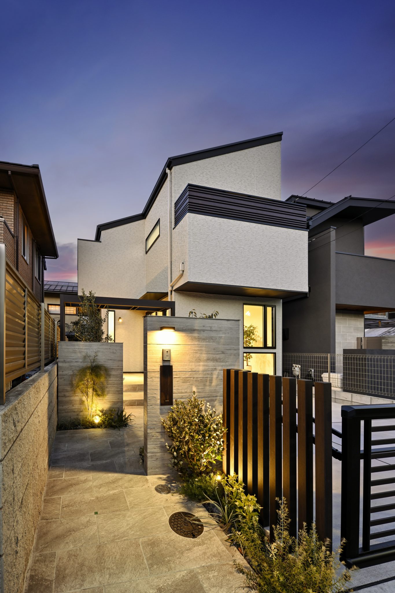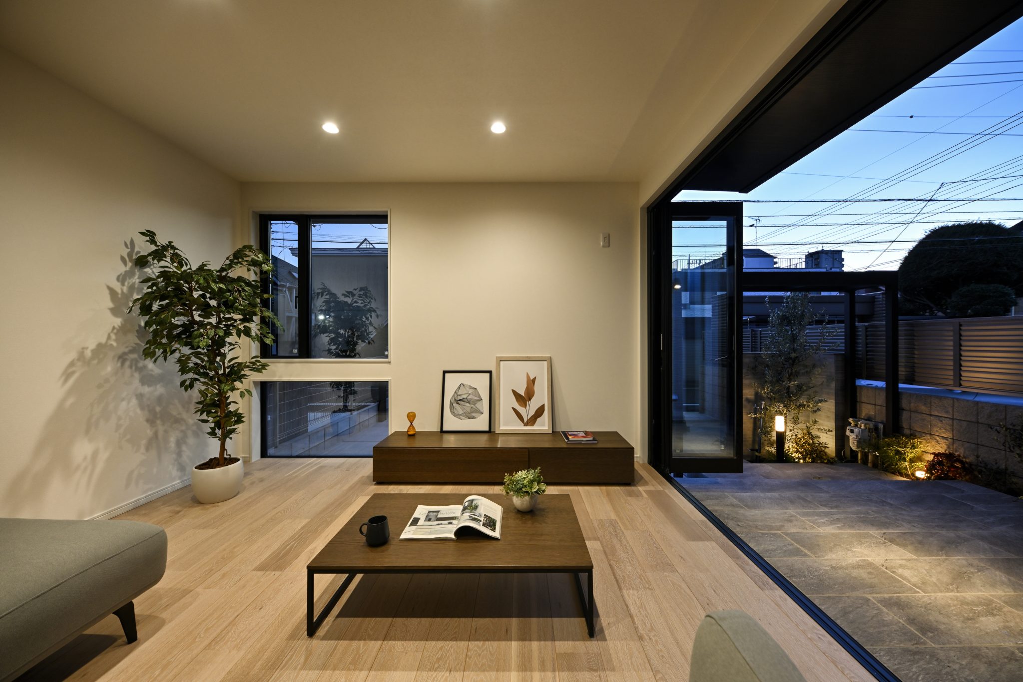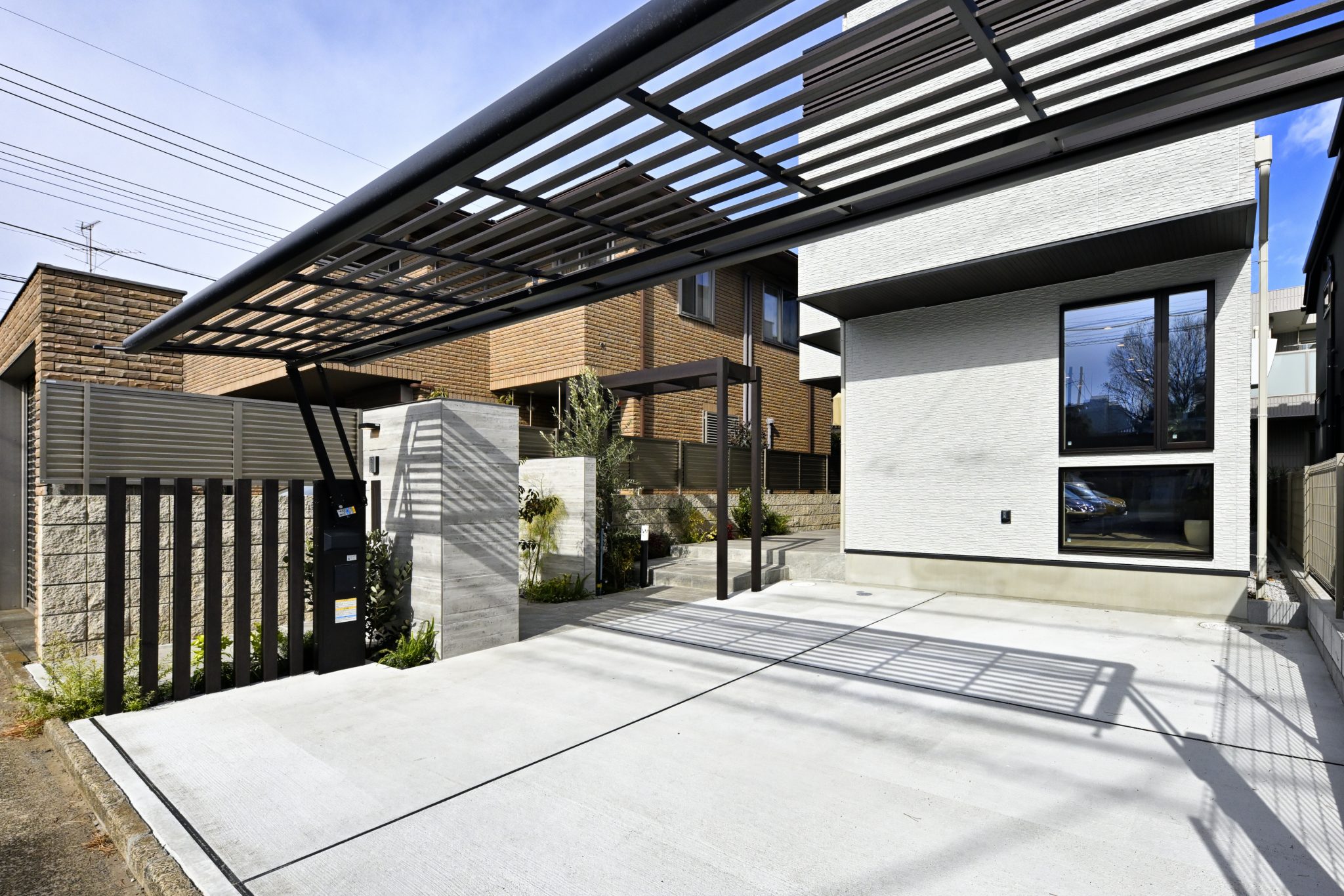 こちらのお宅は、リビングダイニングから繋がるタイルデッキによって、上質で高級感のある空間を実現しています。また、タイルデッキ横には目隠し用のフェンスを設け、玄関からのアプローチにも視界を遮る工夫をすることで、よりプライベートな空間を確保しています。さらに、タイルデッキは、その見た目の美しさだけではなく、ウッドデッキに比べ、紫外線や雨による劣化が少なく、掃除が簡単でメンテナンスも非常に楽なことも特徴です。