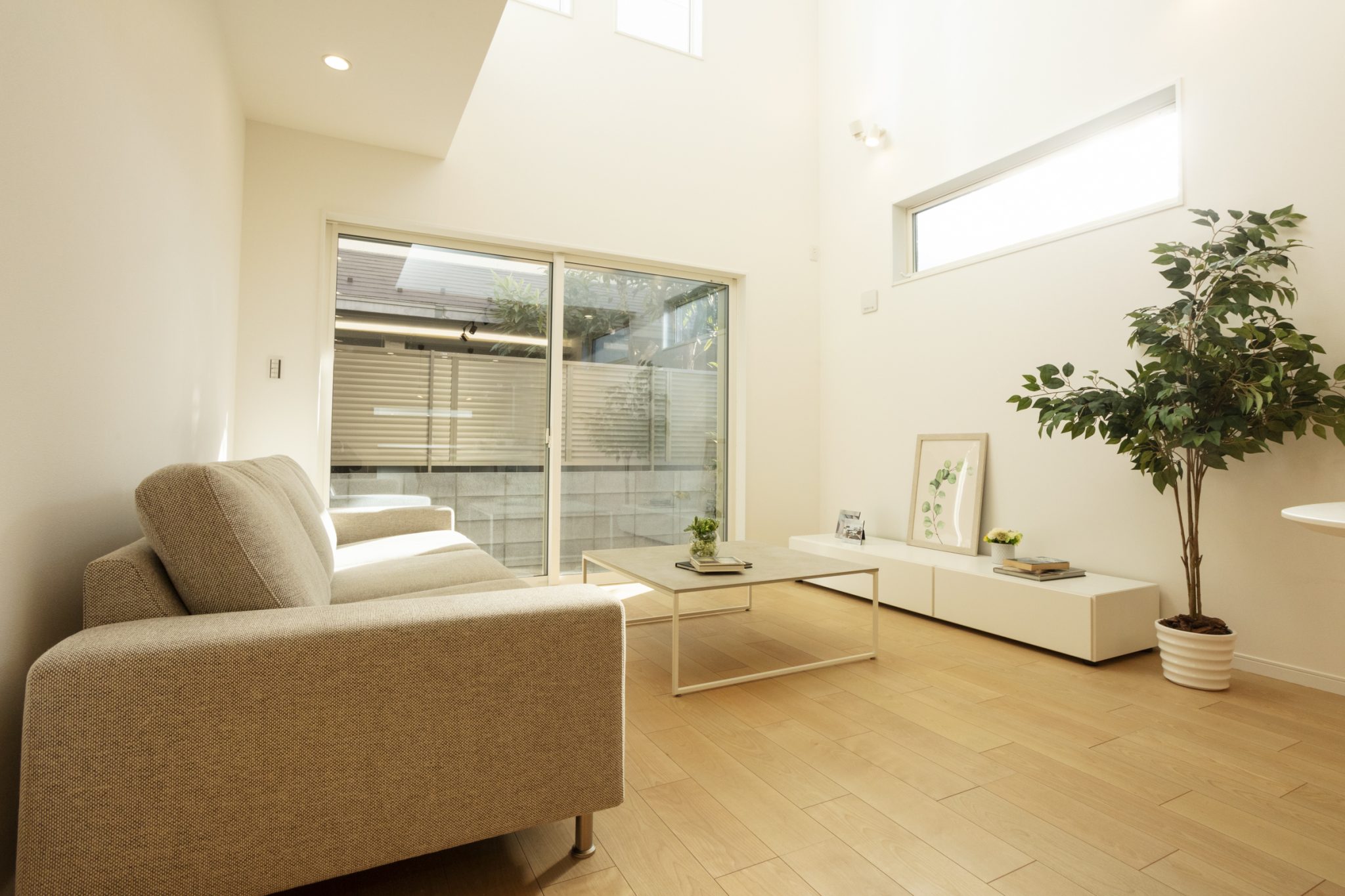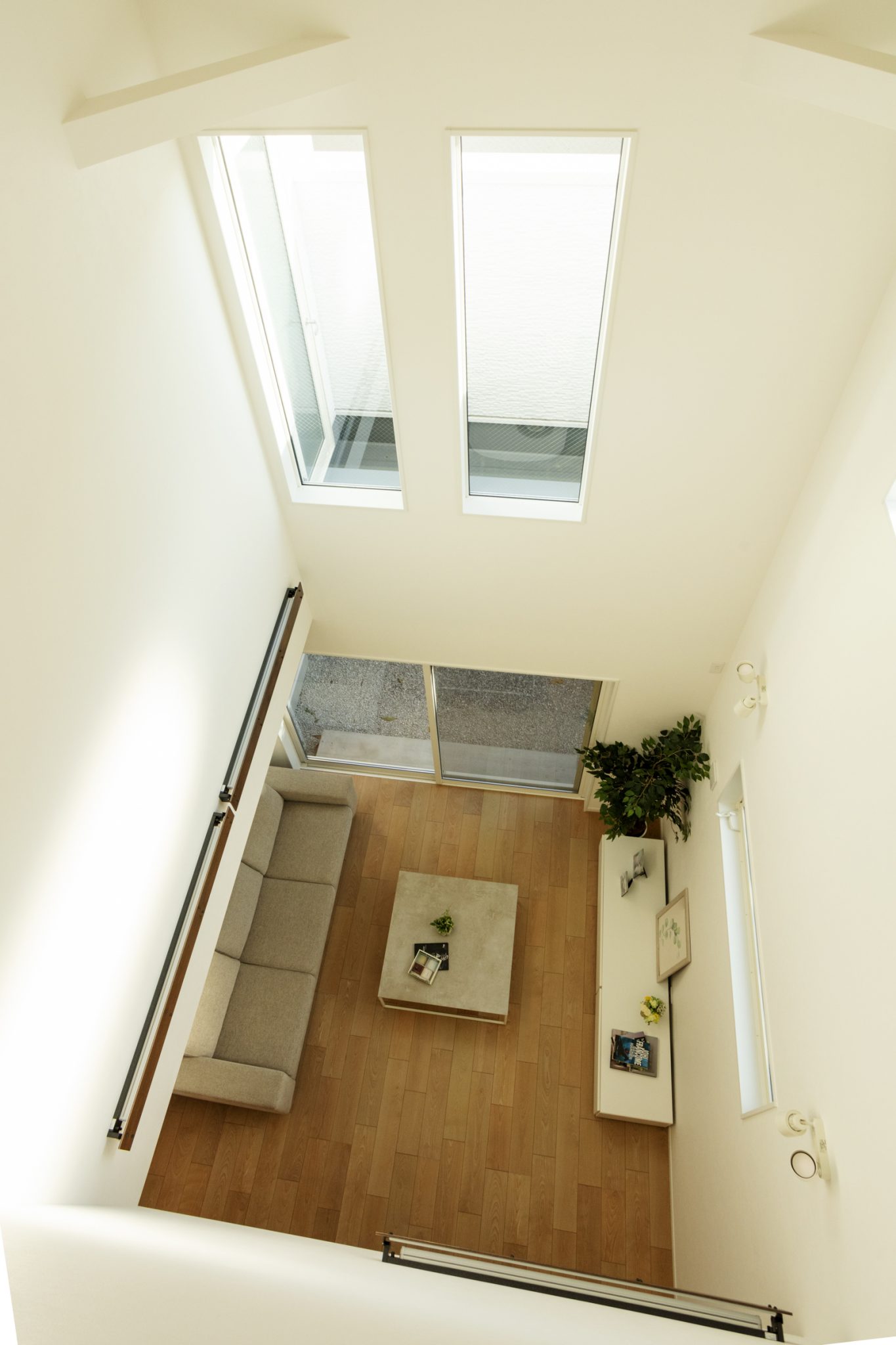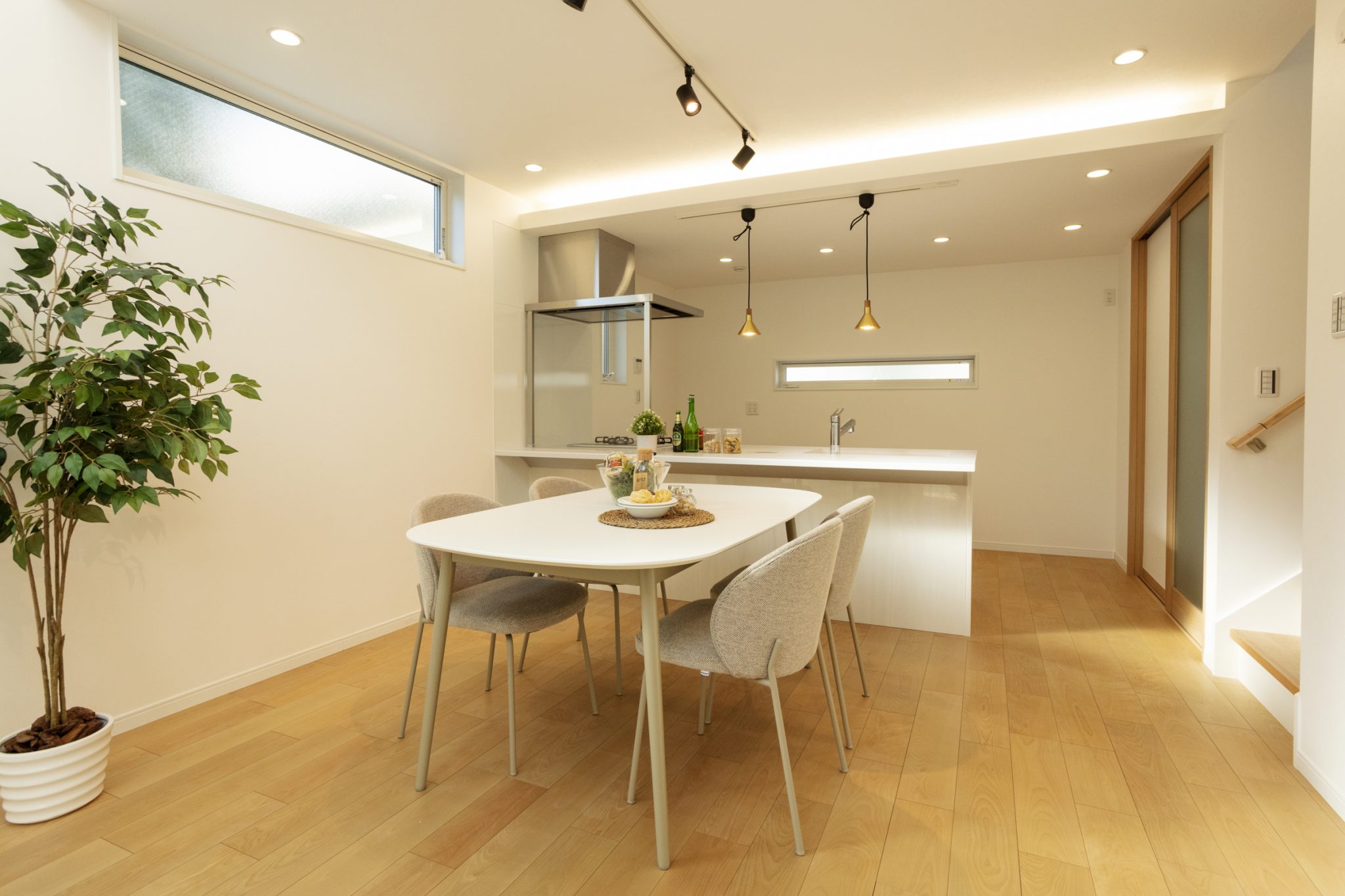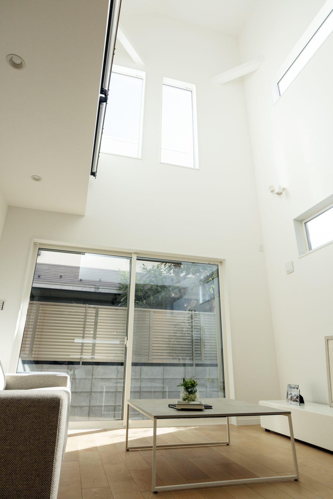 隣り合う2棟を担当させていただきました。 こちらのお宅は、住宅が隣接するエリアに位置しているため、プライバシーを重視し1階に大きな窓を設置できませんでした。そのため、1階と2階に吹き抜けの空間を取り入れることで、1階にも自然光がたっぷりと降り注ぐ明るいリビングを実現しました。また、開放感が生まれ、風通しも良く、快適で気持ちの良い空間となっています。さらに、キッチンにはガラスパーテーションを設置することで、視線を遮らず、いつでも室内を見渡すことができます。