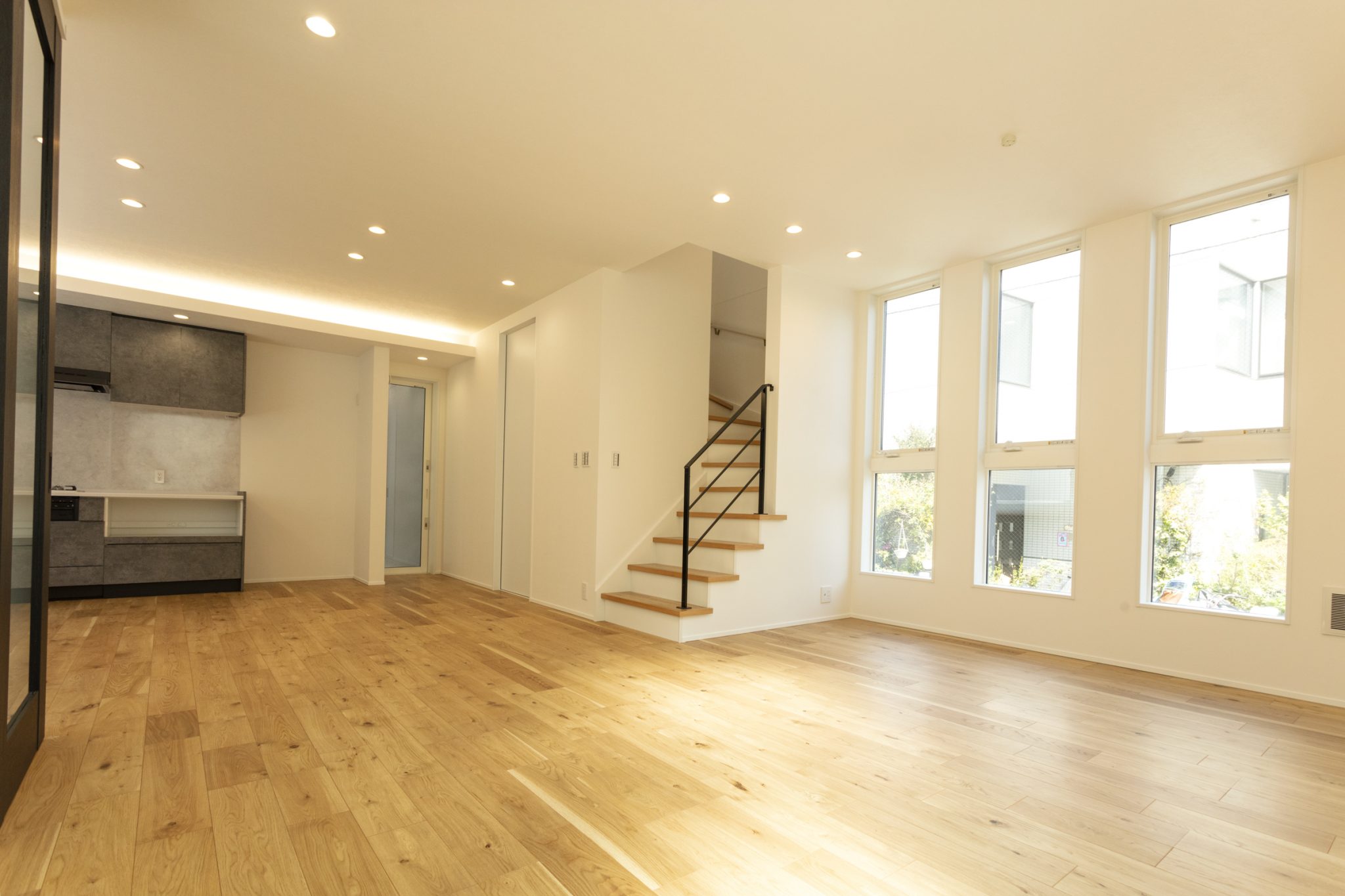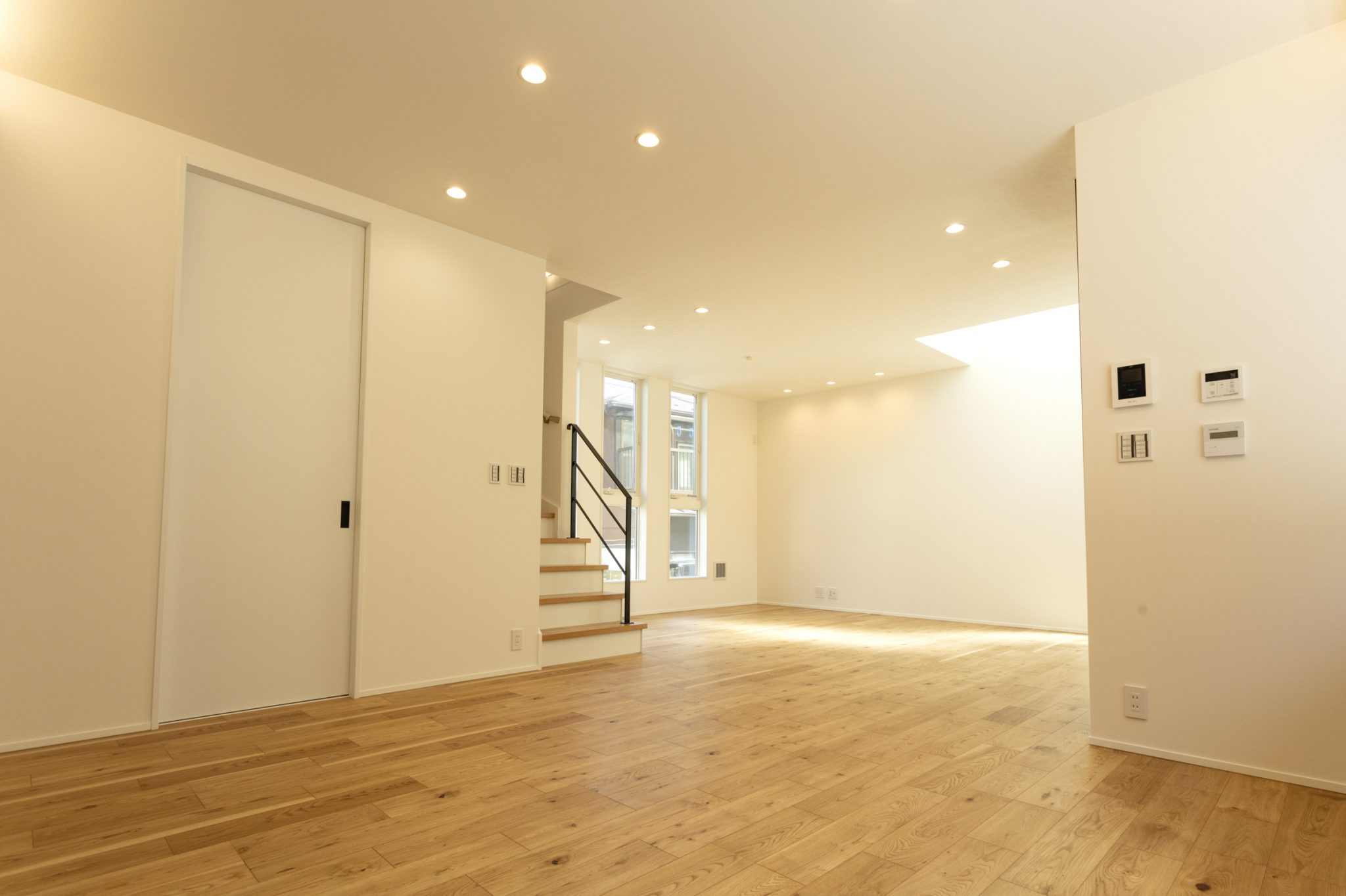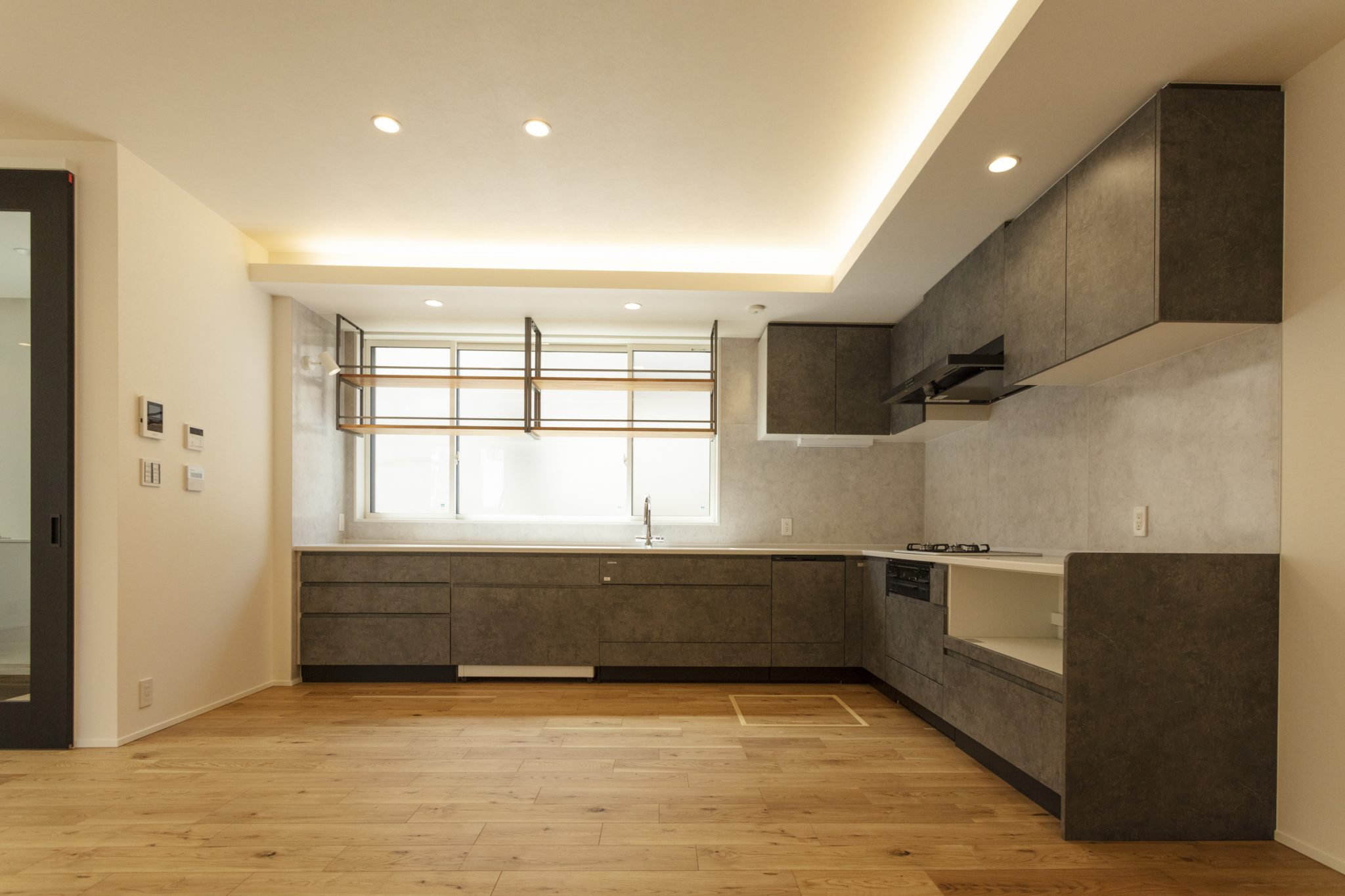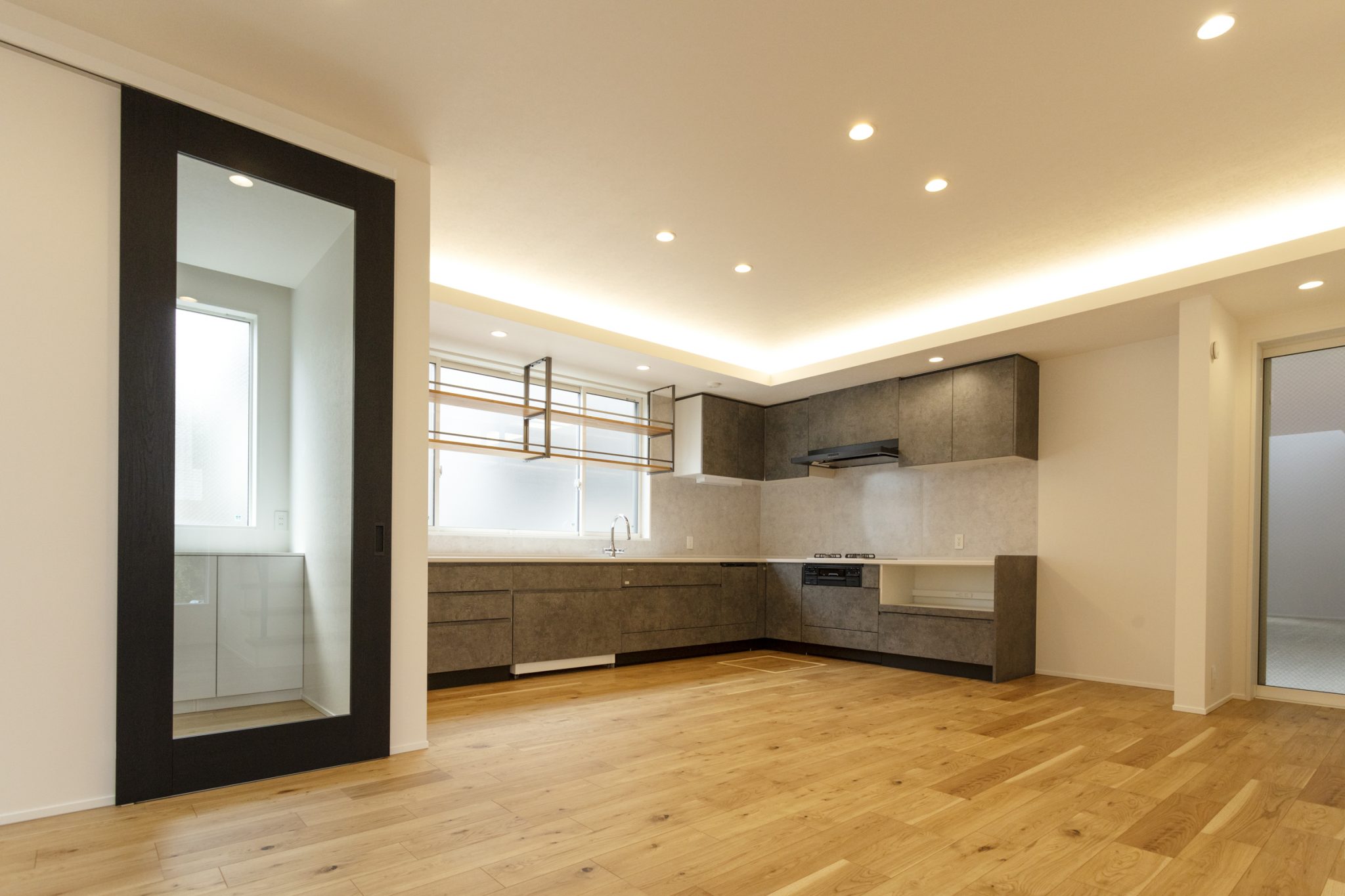 こちらのお宅の特徴は、大きなL字キッチンです。 L字型のキッチンレイアウトは、広いカウンタースペースと十分な収納を備え、料理の準備や片付けがスムーズに行えるようデザインされています。また、キッチンとダイニングエリアが近く、家族全員で料理を楽しみながらコミュニケーションを取ることができます。 さらに、階段を中央に配置することで、リビングとダイニングのエリアが自然と区切られ、各々の用途に応じた使い方が可能です。