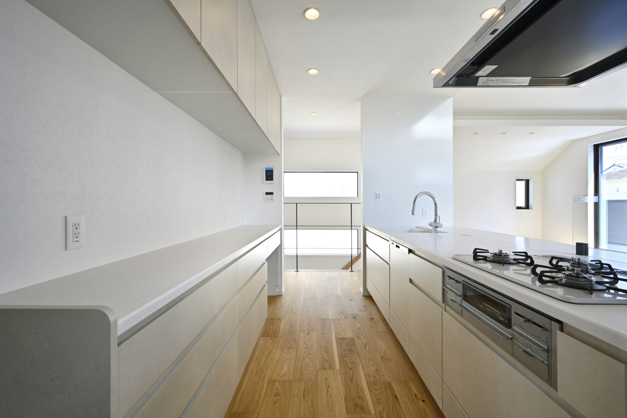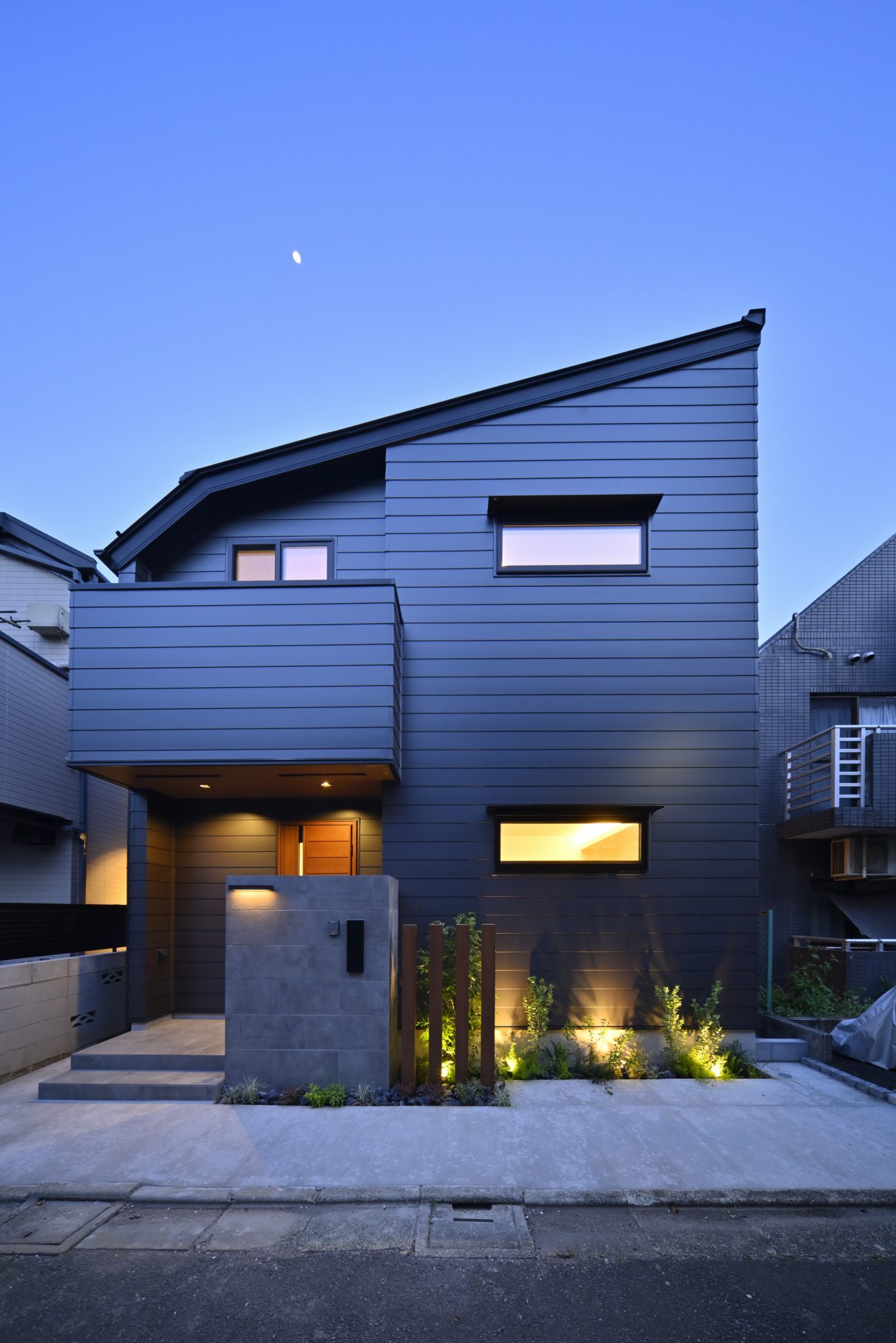 こちらのお宅は、外観にガルバリウム鋼板を使用しており、モダンでスタイリッシュな印象となっています。ガルバリウム鋼板は、耐久性に優れ、長期間にわたって美しい外観を保つことができる素材です。また、軽量で施工がしやすく、デザインの自由度が高いことから、シンプルで洗練された外観を実現しています。 さらに、ガルバリウム鋼板の独特な質感は、外構のライティングにも映え、夜間には光が美しく反射し、外観全体を一層際立たせます。これにより、お家の印象が昼夜を問わず魅力的に、周囲の景観に調和しながらも個性的な存在感を放ちます。