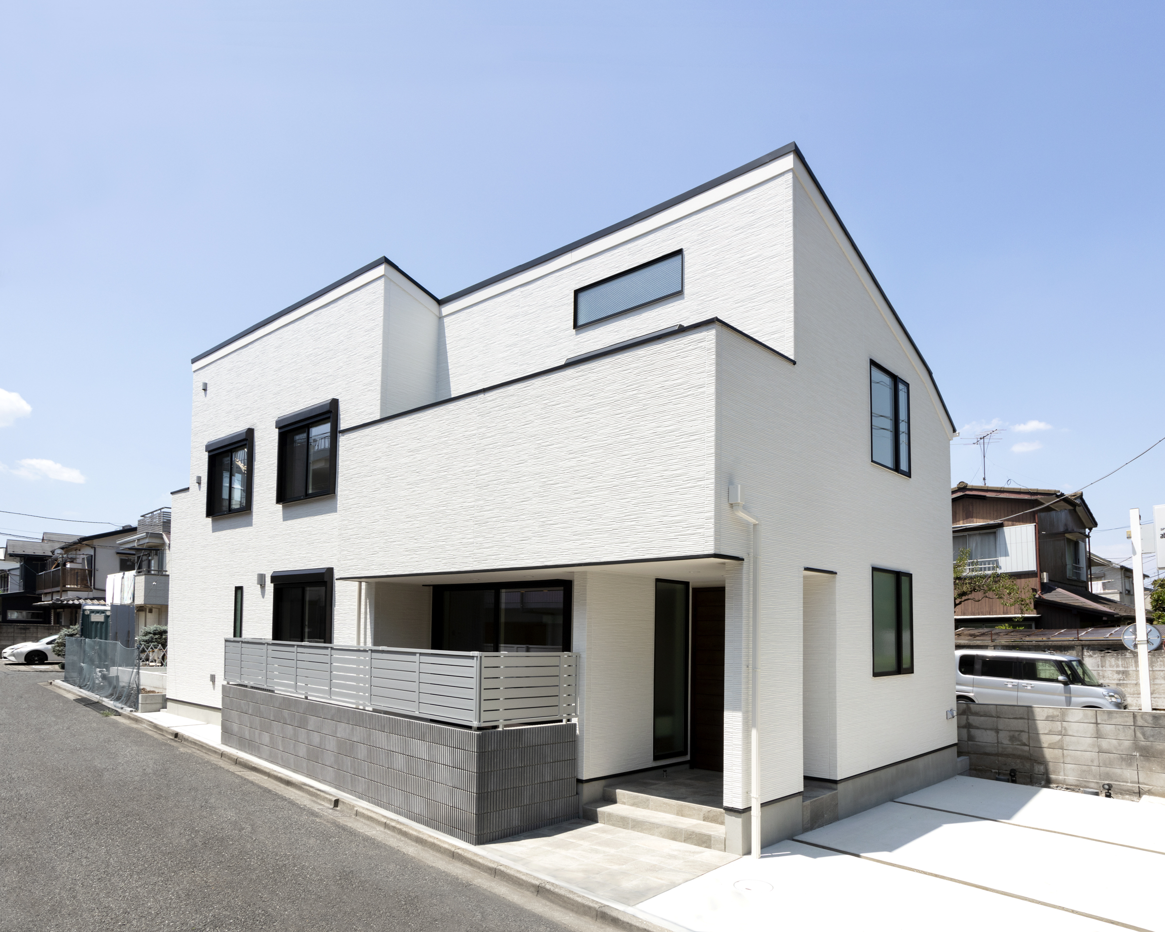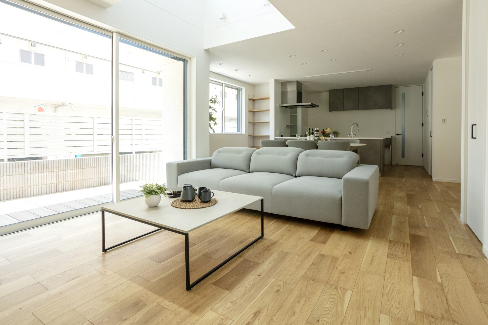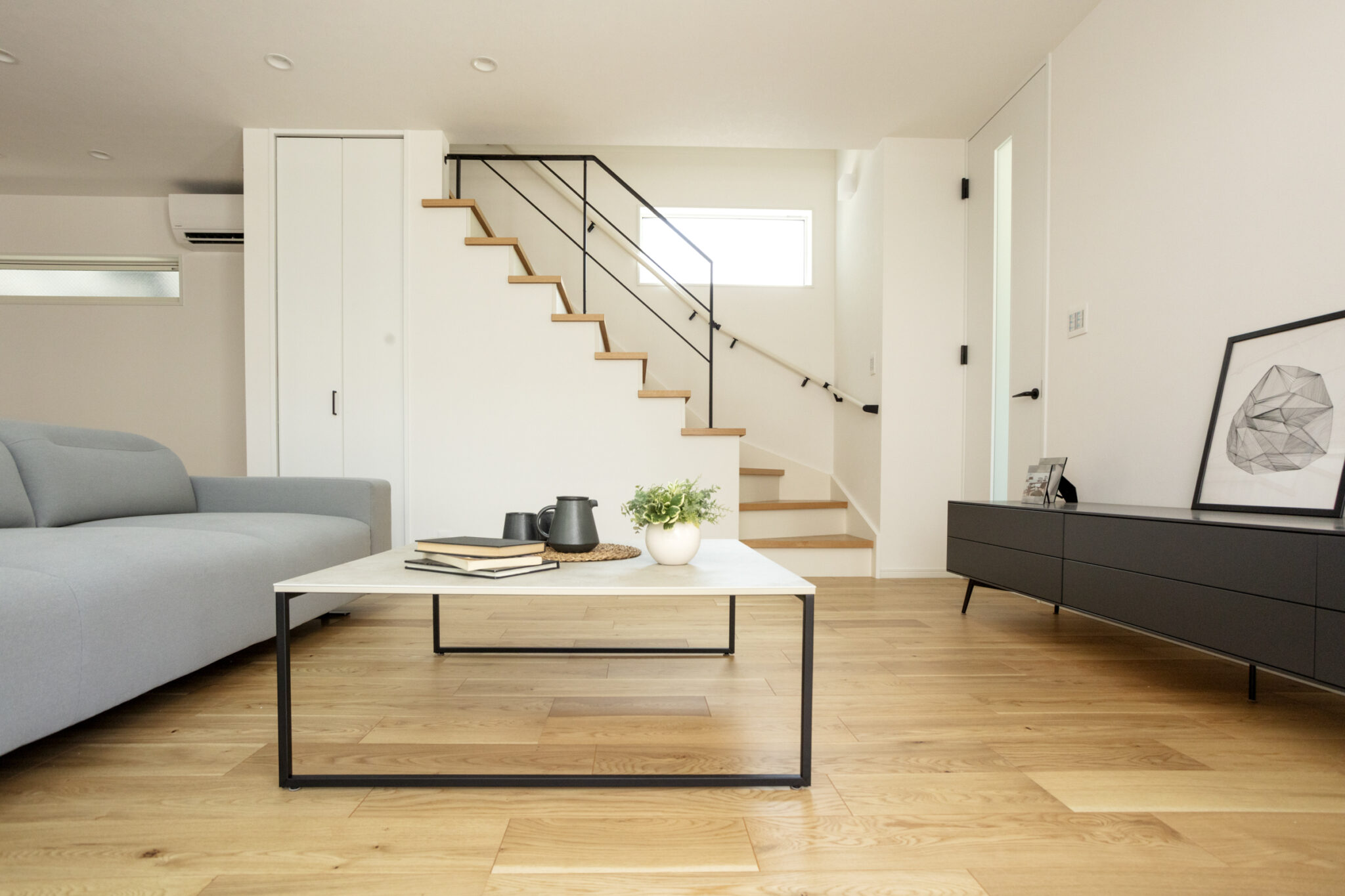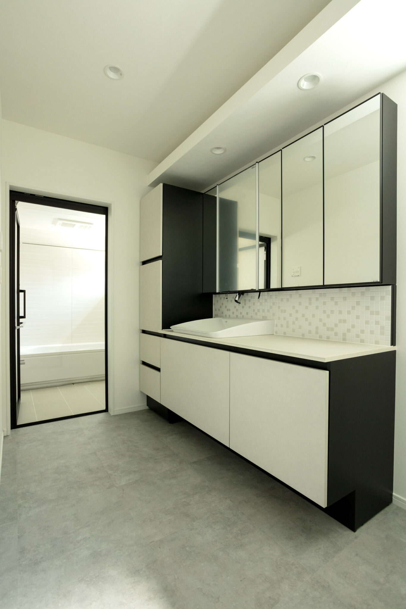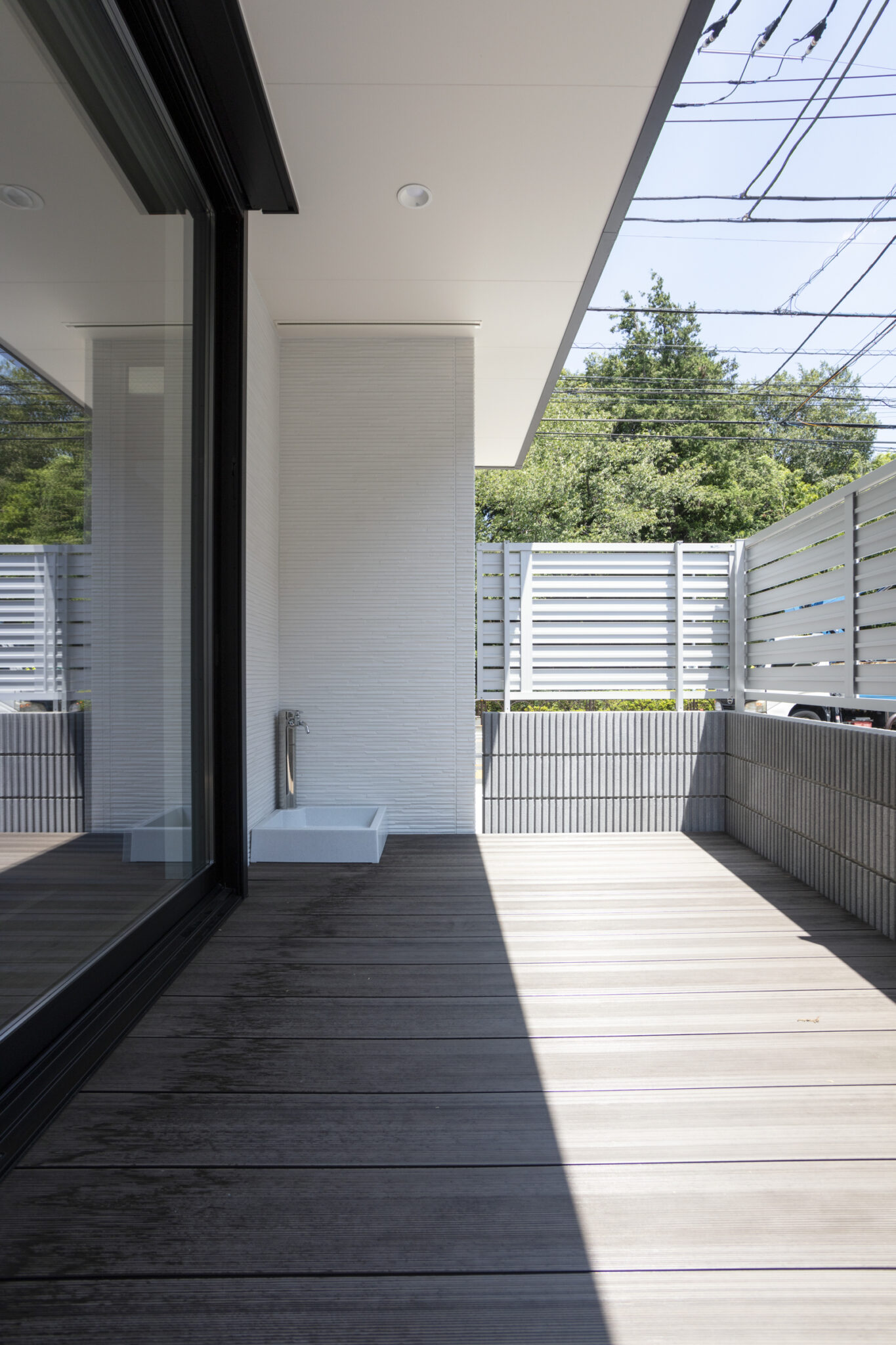 こちらのお宅は、広々としたリビングとウッドデッキが魅力的なデザインです。リビングは大きな窓からたっぷりと自然光が差し込み、ウッドデッキへと繋がる開放感のある空間が広がっています。ウッドデッキは、家族でリラックスした時間を過ごしたり、アウトドアリビングとして楽しむのに最適な場所となっています。 また、洗面所兼脱衣所には、豊富な収納棚が設けられており、タオルや洗剤、日用品などをすっきりと整理整頓できるようになっています。