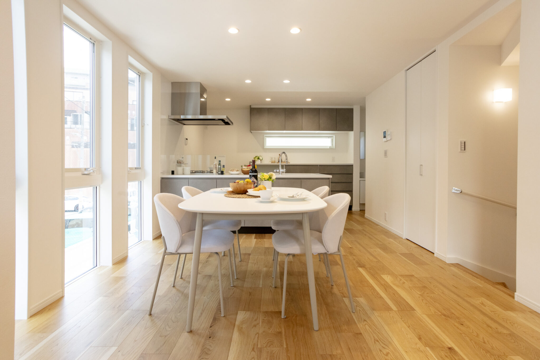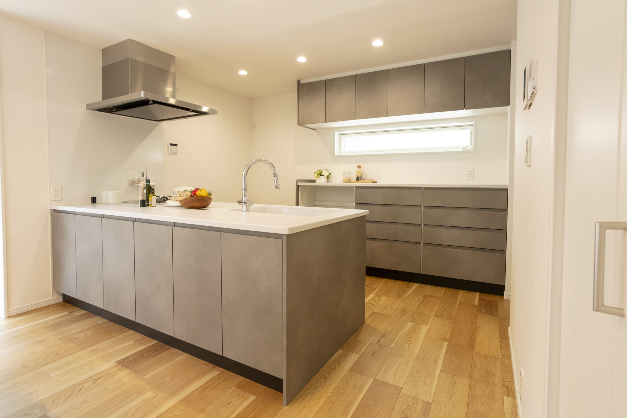 こちらのお宅は、収納力抜群のキッチンとリビングに設けられたワークスペースが特徴です。キッチンには、豊富な収納スペースが用意されており、調理器具や食材をすっきりと整理できます。ダイニング側にも収納があり、日常的に使うアイテムを便利に収納できるため、キッチン周りが常に整頓された状態を保つことができます。 また、リビングには実用的なワークスペースが設置されており、大人の仕事やこどもの勉強に最適です。このスペースはリビングの一部として自然に組み込まれており、家族全員がそれぞれの時間を快適に過ごしながら、家族とのコミュニケーションが取りやすい環境が整っています。