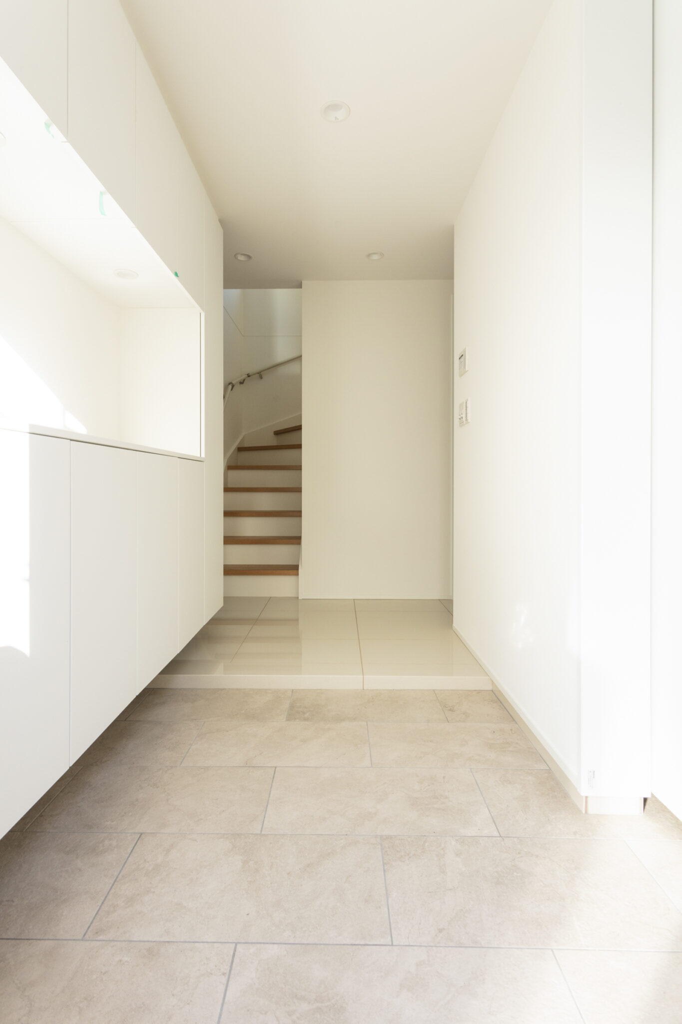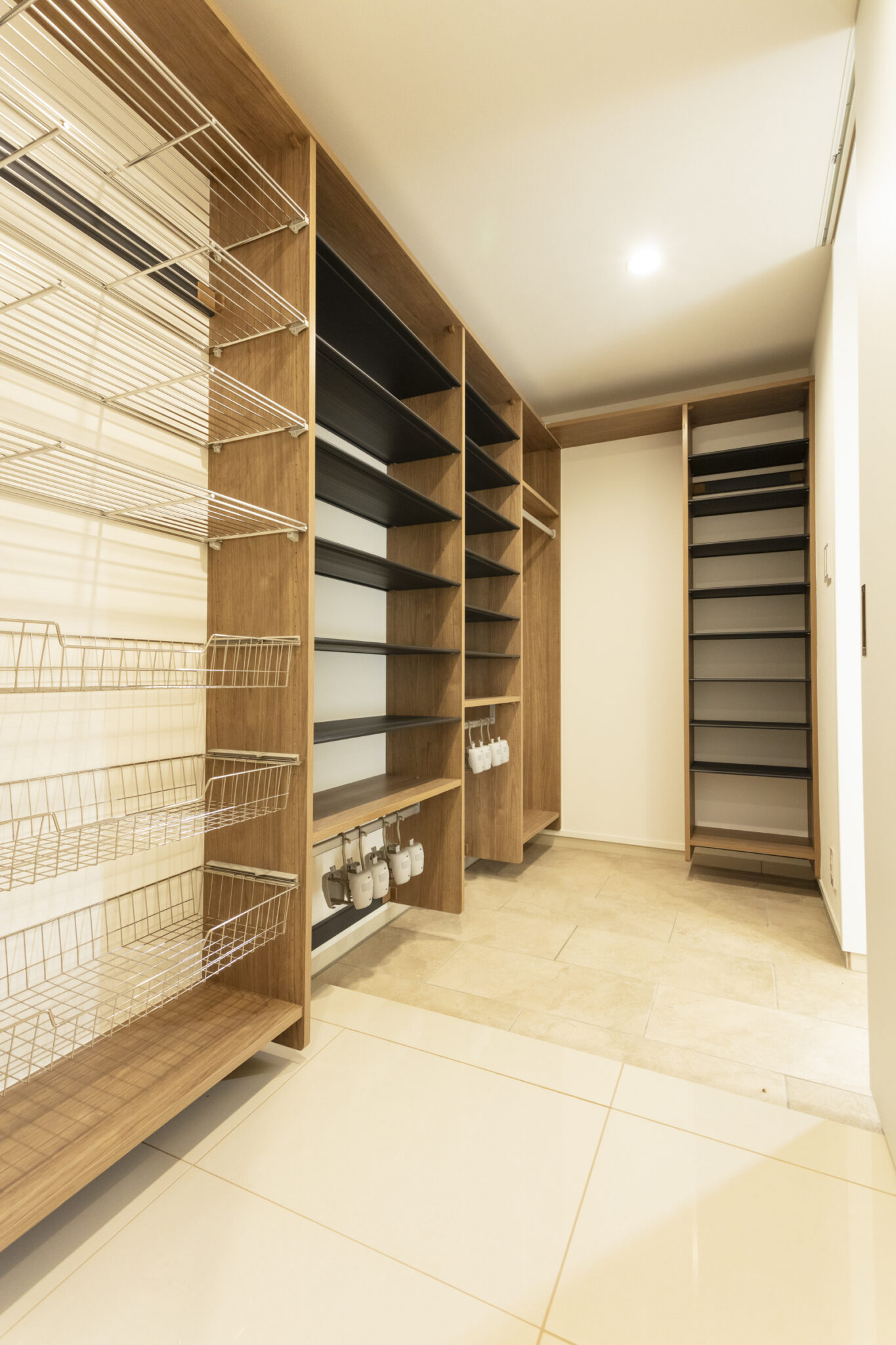こちらのお宅は、土間収納(シューズクローク)が特徴的です。広々とした土間収納は、靴やアウトドア用品、ベビーカーなどをすっきりと収納できるスペースを提供し、玄関周りを常に整頓された状態に保つことができます。通気性が良く、湿気対策も施されているため、靴やその他の収納物が快適に保たれます。 また、土間収納は、家族全員が使いやすいようにデザインされており、入ってすぐの場所にあるため、帰宅時にさっと靴を脱いで収納できるのも便利です。機能性と使い勝手を重視したこの土間収納が、お家の快適さを一層高めています。