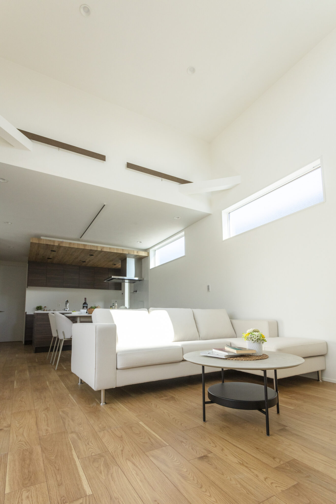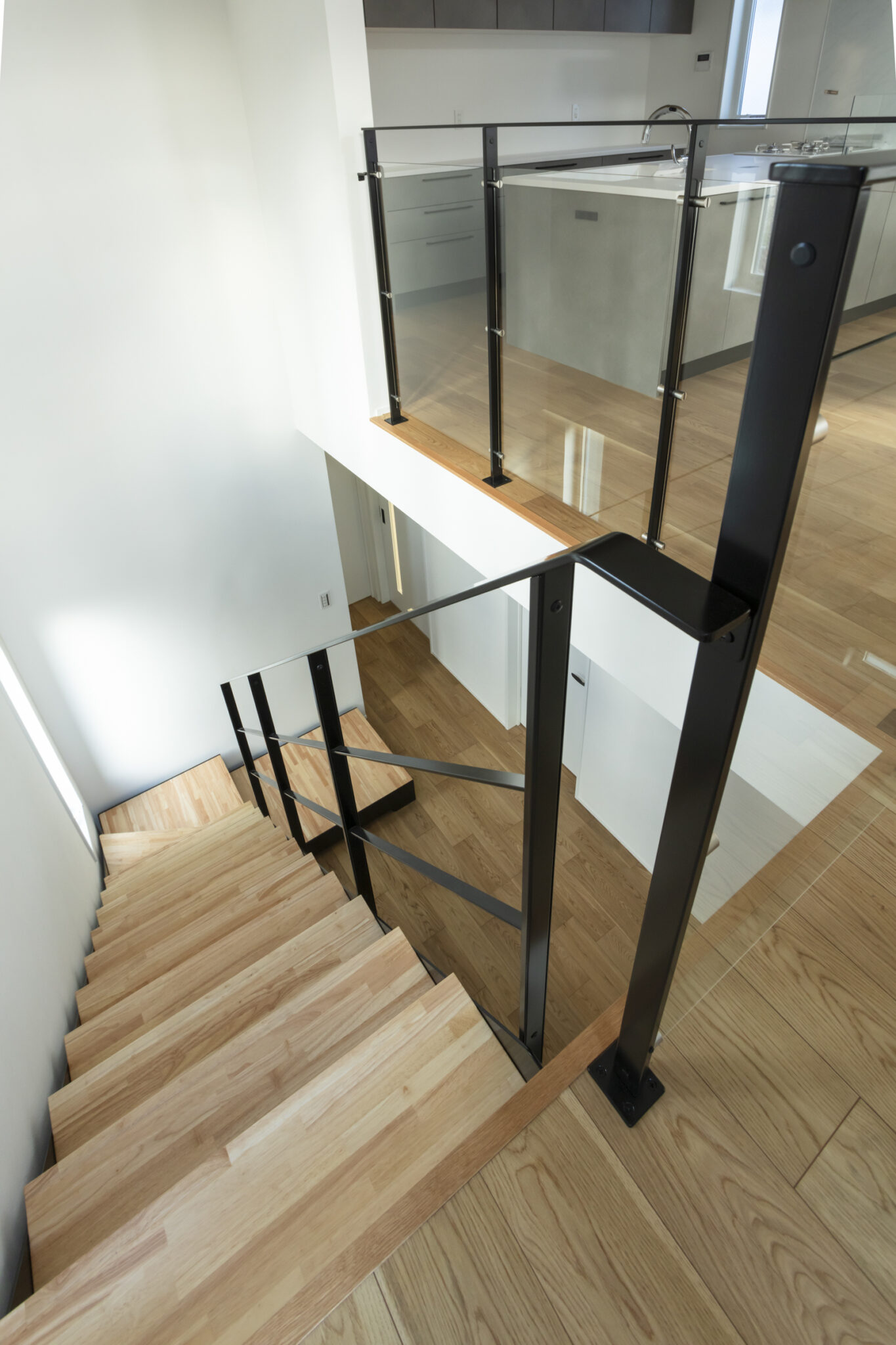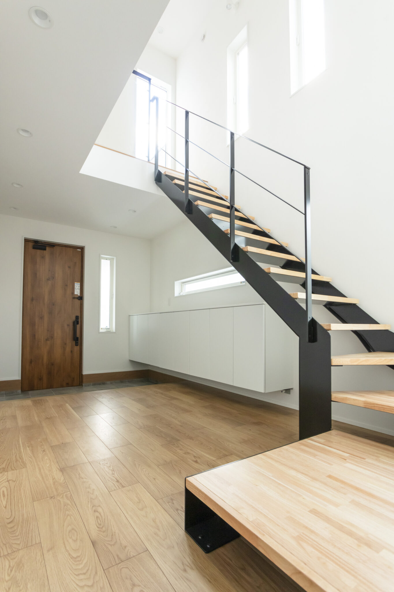 こちらのお宅は、オープン型階段が特徴的です。オープン型階段は、従来の閉じられた階段とは異なり、階段の下が空いており、視覚的に開放感をもたらします。このデザインにより、玄関ホールとリビングダイニングとのつながりが強調され、家全体に広がりを感じさせる効果があります。 さらに、オープン型階段は、自然光を階段周りにふんだんに取り入れることができるため、明るく温かみのある空間となっています。